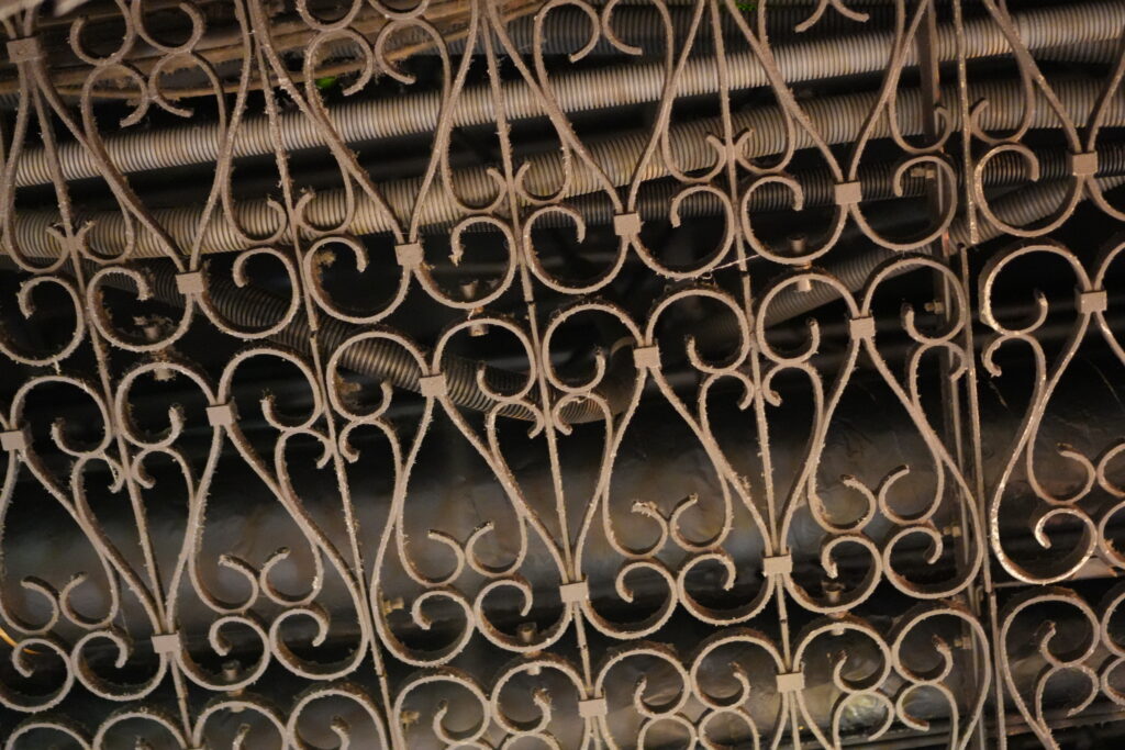 配管等が見えないように、お洒落な格子を設けてるんですね。これは良いなと思いました。都内の駅は工事が頻繁にあるせいか、配管が丸出しの駅も多いですからね。
